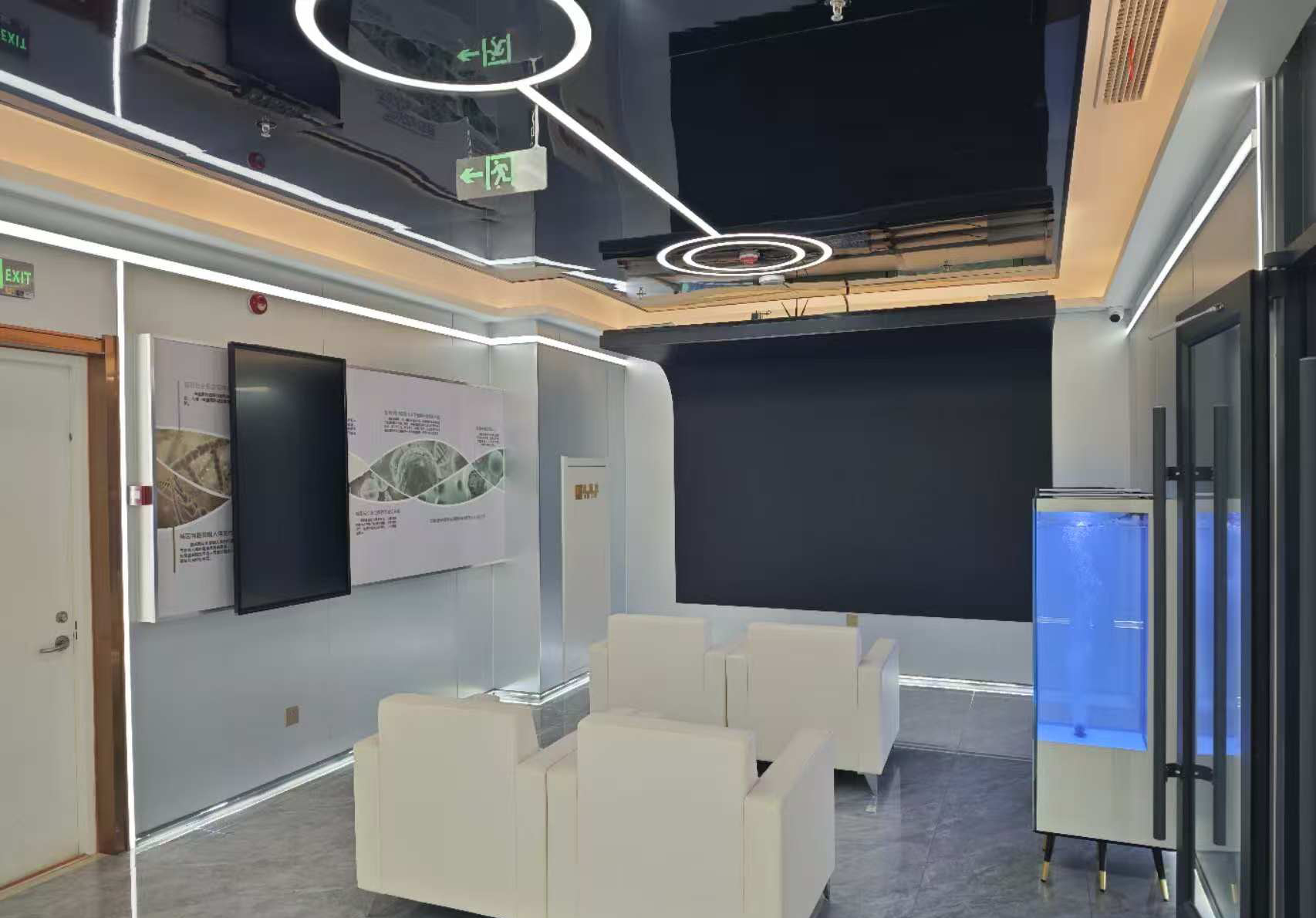 入口区域,拉丝不锈钢板被严谨地拼接成一道引导性廊道。顶部嵌入的线性灯带,光线均匀而克制,直接指引视线深入展厅内部,奠定了整体空间的科技基调。