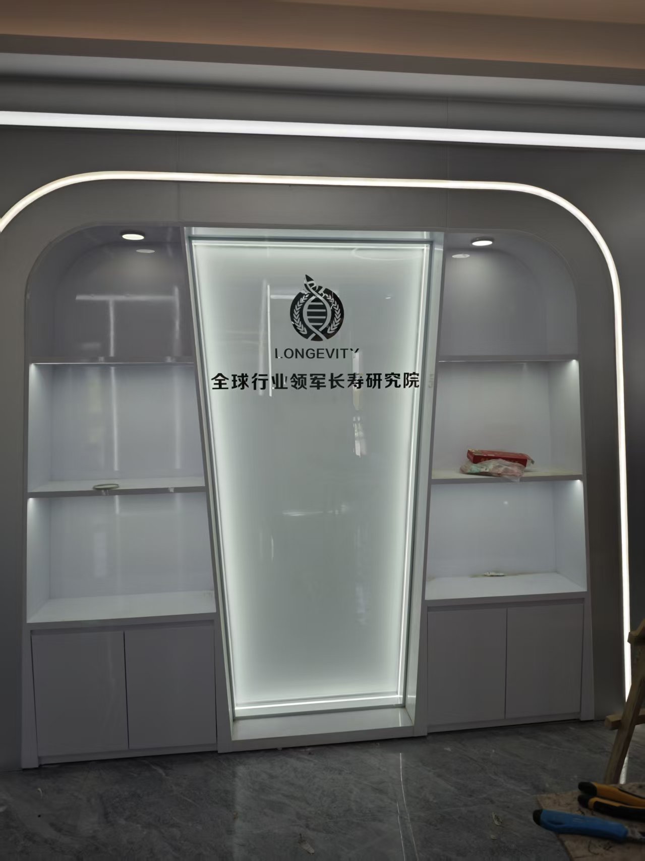进入主展厅,材质的专业运用更为显著。拉丝不锈钢型材被地用于分割空间,构架出“专家顾问墙”、“核心数据(BMI)”及“品牌形象(LONGEVITY)”等展项。每一块磨砂玻璃展板都被稳固地嵌入不锈钢骨架中,接缝严密,工艺考究。